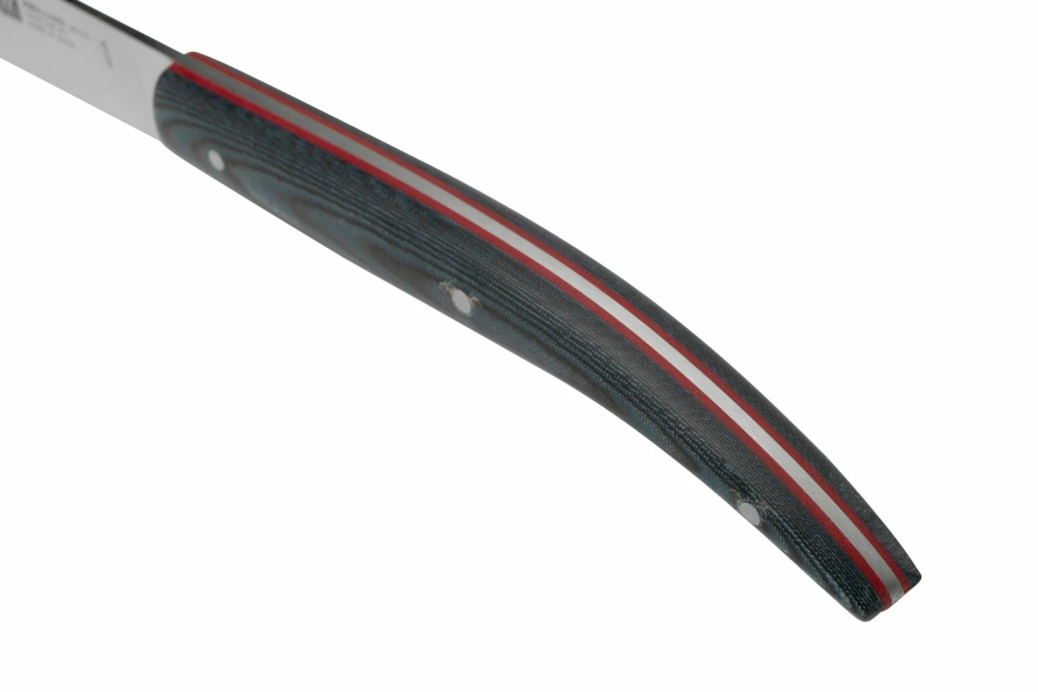 Este juego de cuchillos para carne de 4 piezas en micarta azul de Zwilling es un elegante y moderno juego de cuchillos para carne con un toque de historia. El diseño se basó en los cuchillos de carne del siglo XVIII de Albacete (España). Puede que el diseño sea clásico, pero el acero y el acabado garantizan niveles modernos de calidad.